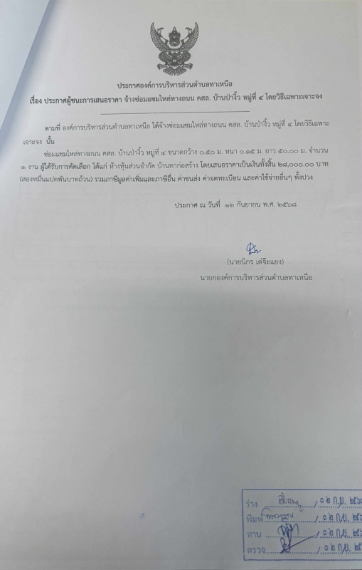 ประกาศผู้ชนะการเสนอราคา จ้างซ่อมแซมไหล่ทางถนน คสล. บ้านป่างิ้ว หมู่ที่ 4 โดยวิธีเฉพาะเจาะจง