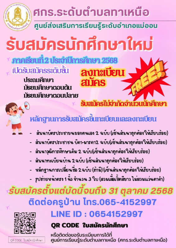 ฝากประชาสัมพันธ์ จาก ศกร.ระดับตำบลทาเหนือ เรื่อง การรับสมัครนักศึกษาใหม่ ภาคเรียนที่ 2 ประจำปีการศึกษา 2568